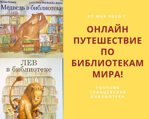 27 мая в 12 часов Сланцевская центральная детская библиотека приглашает всех совершить виртуальное путешествие по библиотекам мира, приуроченное к Общероссийскому Дню библиотек. Виртуальные участники встречи смогут не только посмотреть презентацию о самых удивительных и уникальных библиотеках мира, но и познакомиться с детскими изданиями, рассказывающими о необычной, и порой фантастической жизни современных библиотек. Это книжки-картинки Мишель Кнудсен «Лев в библиотеке»