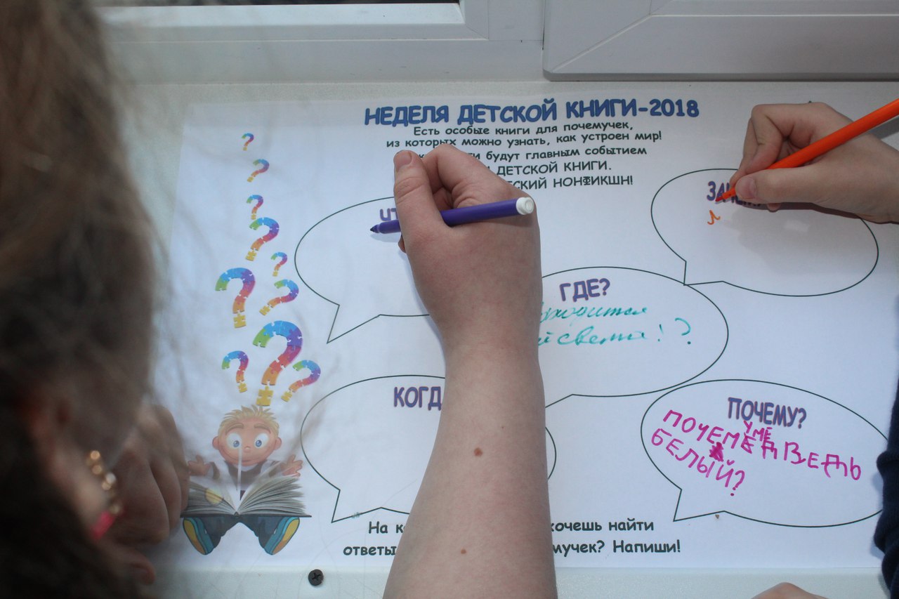 В преддверии Недели детской и юношеской книги в школах № 1, 3, 6 прошло акции «Книжная перемена». Во время этих акций школьники придумывали темы и вопросы для научно-популярных книг, которые они хотели бы прочитать. Было очень интересно придумывать идеи для новых, ещё не написанных книг в стиле НОН-ФИКШН! Во время Недели проходили акции «ЧИТАЕМ СКАЗКИ С ВОПРОСАМИ» для малышей, которые проводили лидеры чтения в детских садах. Они читали детям сказки Киплинга и Бианки и играли с ними.