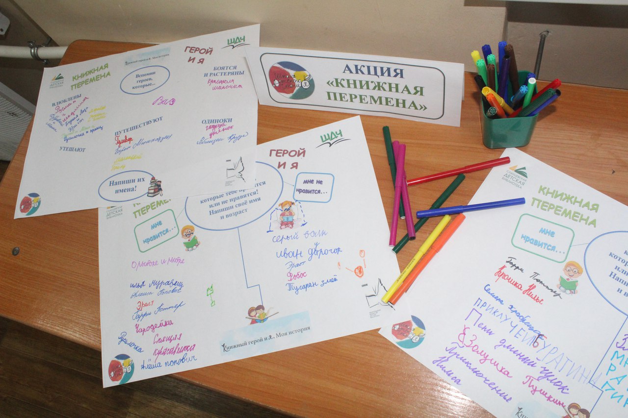 Открыла ШДЧ-2016 АКЦИЯ «КНИЖНАЯ ПЕРЕМЕНА» в школах города. Библиотекари с лидерами чтения вышли в школы города, чтобы узнать мнения наших читателей об их любимых и нелюбимых книжных героях. Ещё в ходе АКЦИИ дети рассказали библиотекарям и лидерам чтения о книжных героях, которые учат и путешествуют, действуют и бесстрашны, влюблены и одиноки. … Мнения не всегда совпадали, но это и неудивительно – ведь герои хороших книг многогранны, как и живые люди! Так началось наше путешествие по мирам книжных героев.