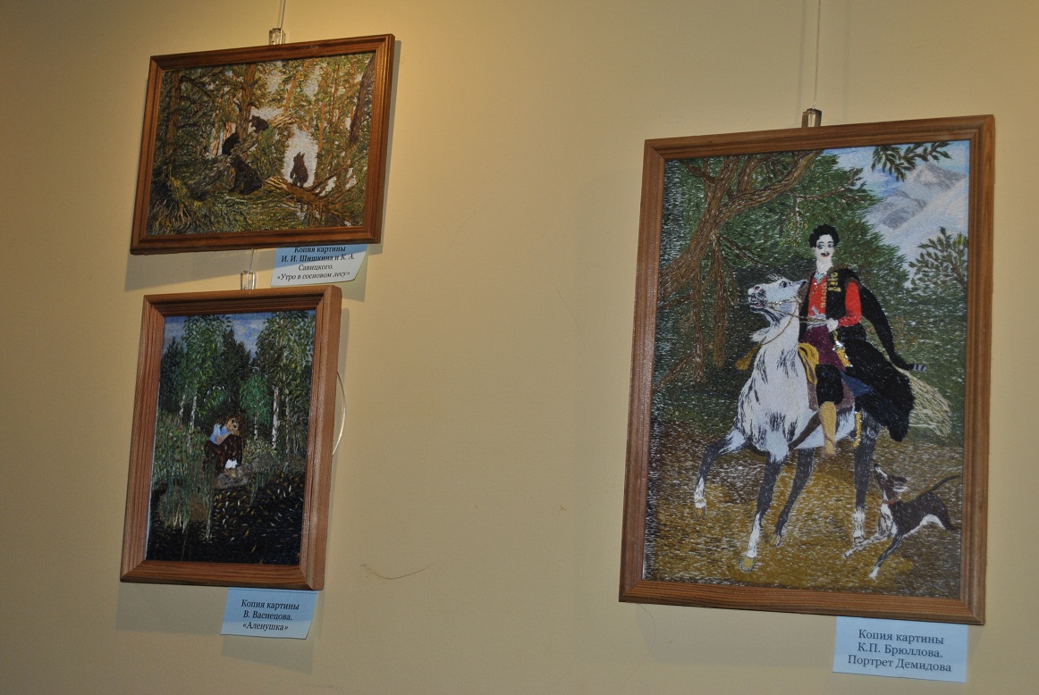 Лидия Григорьевна вышила более 80 полотен. Эскизы она копирует с репродукций великих художников. В её коллекции копии картин Шишкина, Васнецова, Врубеля и многих других художников.