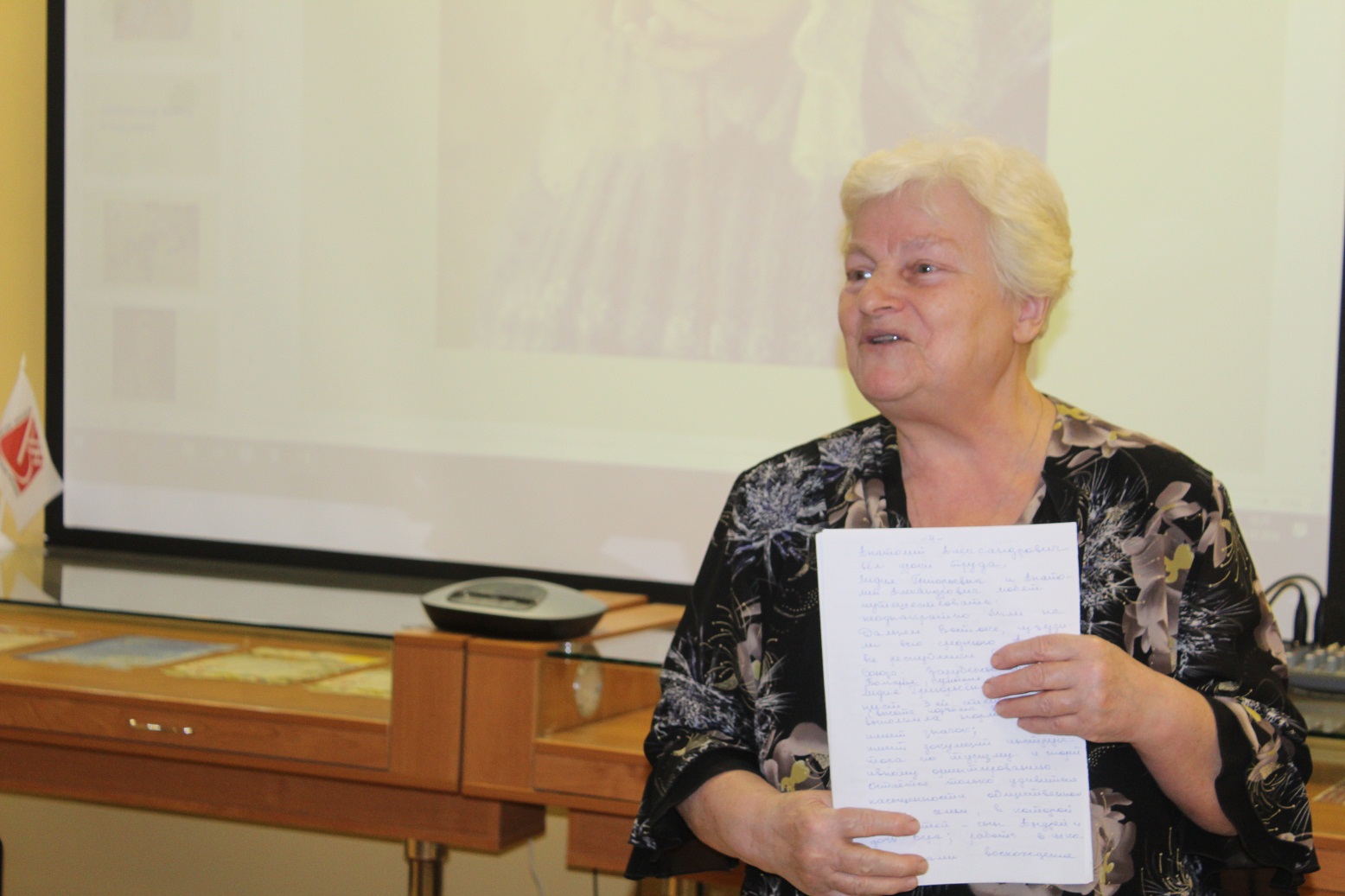 К сожалению, при ехать на открытие выставки Лидия Григорьевна не смогла. Все эти интересные факты о её жизни рассказала Нина Михайловна Сергеева. Она тоже живёт в Овсище, но часто бывает в Сланцевской библиотеке – активный читатель, постоянный участник библиотечных событий.