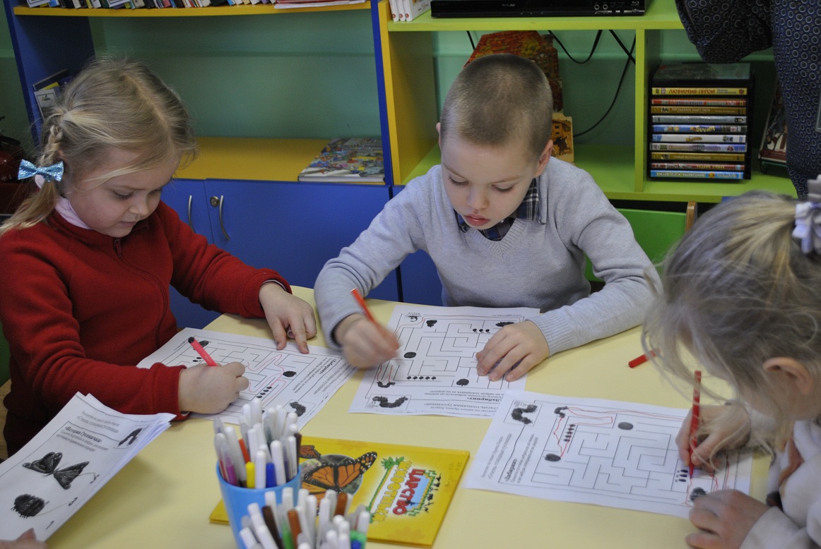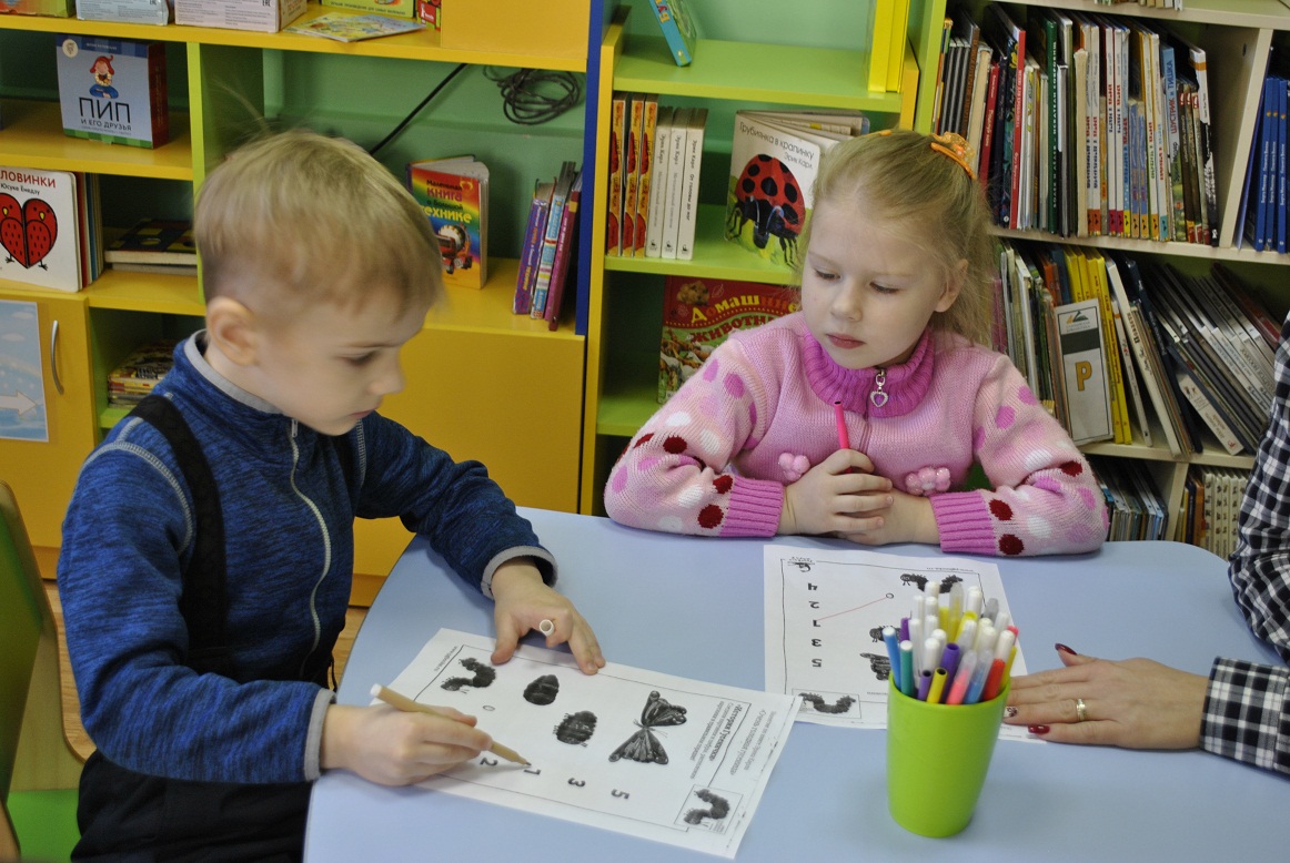 Занятие по книге Эрика Карла «Очень голодная гусеница» дети продолжат в детском саду, раскрасив бабочку – лист с будущей красавицей каждый из них получил на память о встрече в библиотеке.