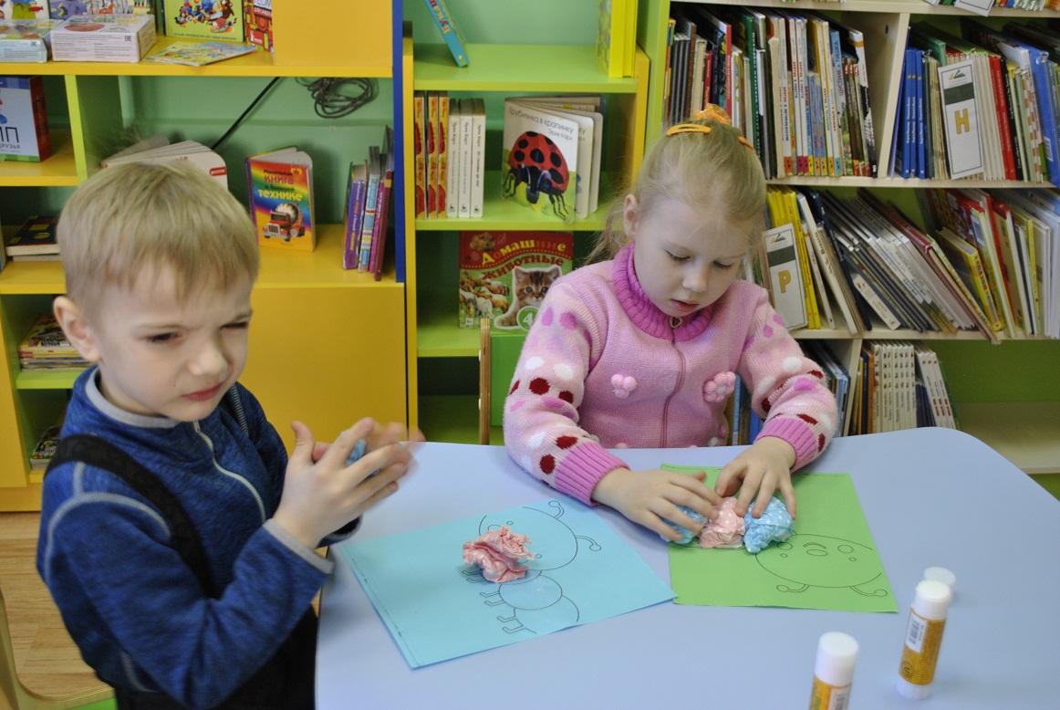 Для того, чтобы понять, как выросла гусеница, Юлия Валерьевна предложила сделать её своими руками с помощью салфеток и клея. Занятие очень понравилось малышам. Они старательно комкали салфетки, приклеивали их к листу бумаги. Кто-то из детишек даже успел нарисовать гусенице глазки, «оживить» её.