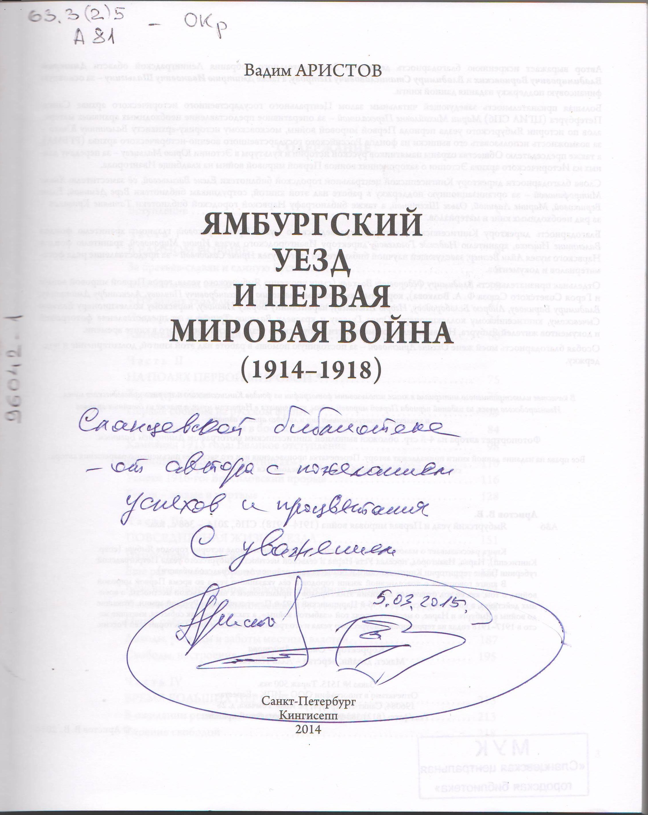 Аристов Вадим Владимирович приезжал к нам в город 22 апреля 2015 г. на историко-краеведческие чтения, посвящённые 85-летию города Сланцы - «Открываем неизвестные страницы прошлого. История края в новых работах исследователей», с презентацией своей новой книги «Ямбургский уезд и Первая мировая война».