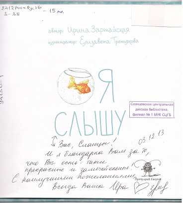 Эта добрая книга учит маленьких читателей, что отсутствие слуха (или любая другая «необычность») не мешает людям находить общий язык — нужно лишь проявить терпение и понимание в общении с таким человеком. Рассказ «Я слышу» в 2011 году вошел в шорт-лист международного конкурса «Литературная Вена».