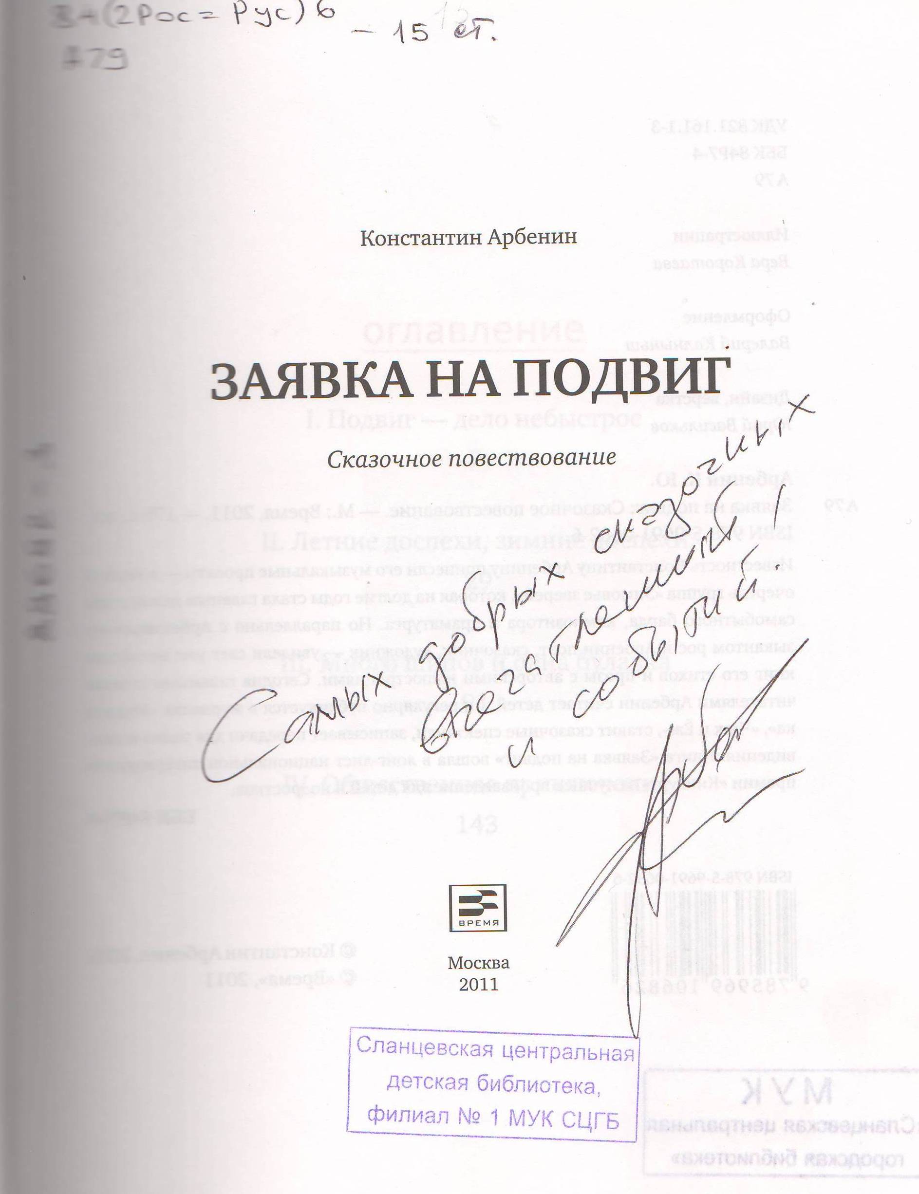 Известность Константину Арбенину принесли его музыкальные проекты в первую очередь группа "Зимовье зверей", которая на долгие годы стала главным делом этого самобытного барда, композитора и драматурга. Но параллельно с Арбениным-музыкантом рос и Арбенин-поэт, сказочник, художник увидели свет уже несколько книг его стихов и прозы с авторскими иллюстрациями. Сегодня главными своими читателями Арбенин считает детей: он регулярно публикуется в журналах "Мурзилка", "Чиж и Ёж", ставит сказочные спектакли, записывает передачи для радио и телевидения. Книга "Заявка на подвиг" вошла в лонг-лист национальной литературной премии Книгуру за лучшее произведение для детей и подростков.