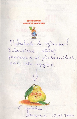 «Побывав в чудесной библиотеке, автор расплылся от удовольствия, как эта груша (см.картинку). С любовью», Сергей Махотин, 17 марта 2004 года.