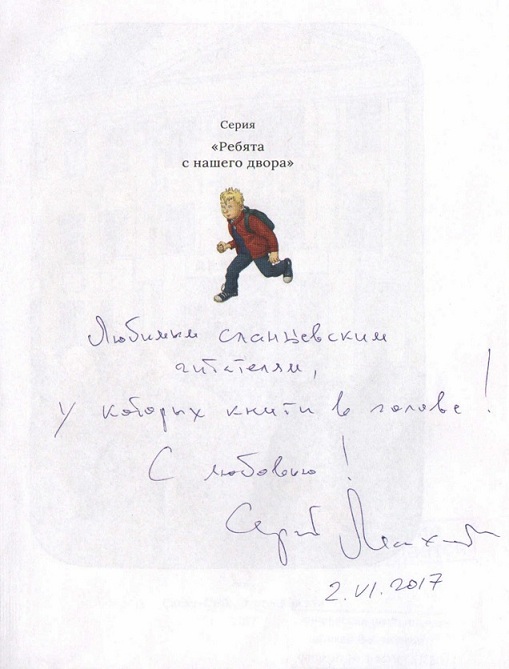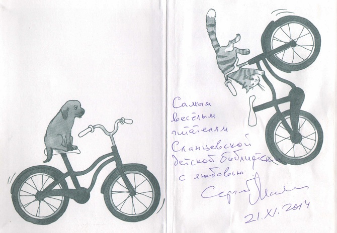 «Самым весёлым читателям Сланцевской детской библиотеки с любовью», Сергей Махотин, 21 ноября 2014 года.