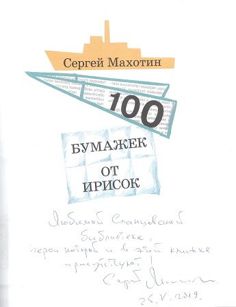 «Любимой Сланцевской библиотеке, герой которой и в этой книжке присутствует!», Сергей Махотин, 25 мая 2019 года.