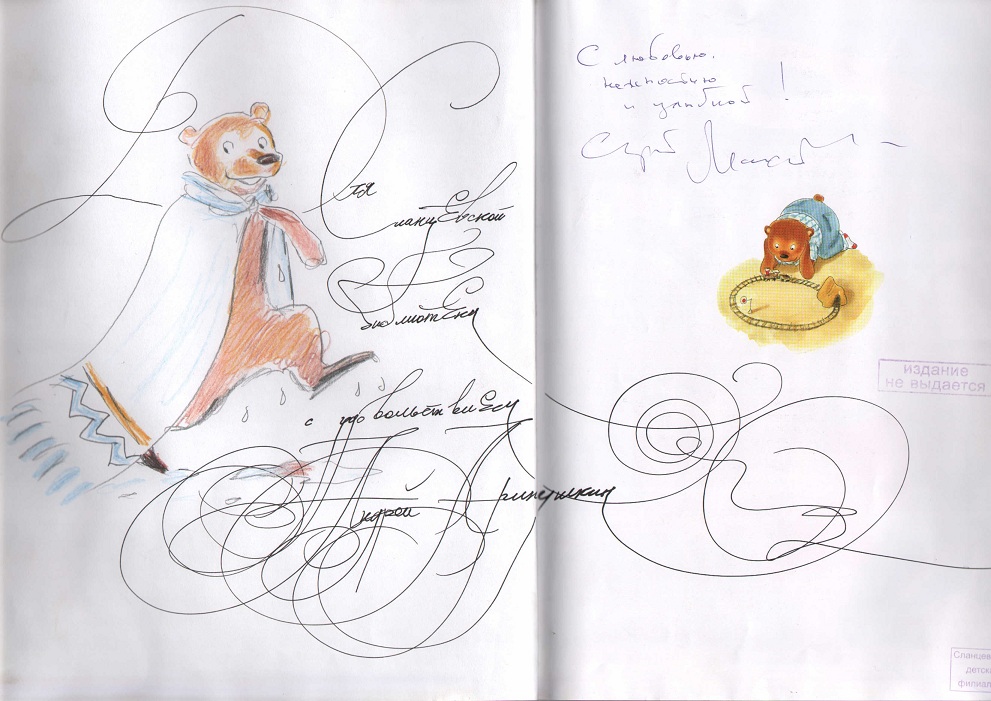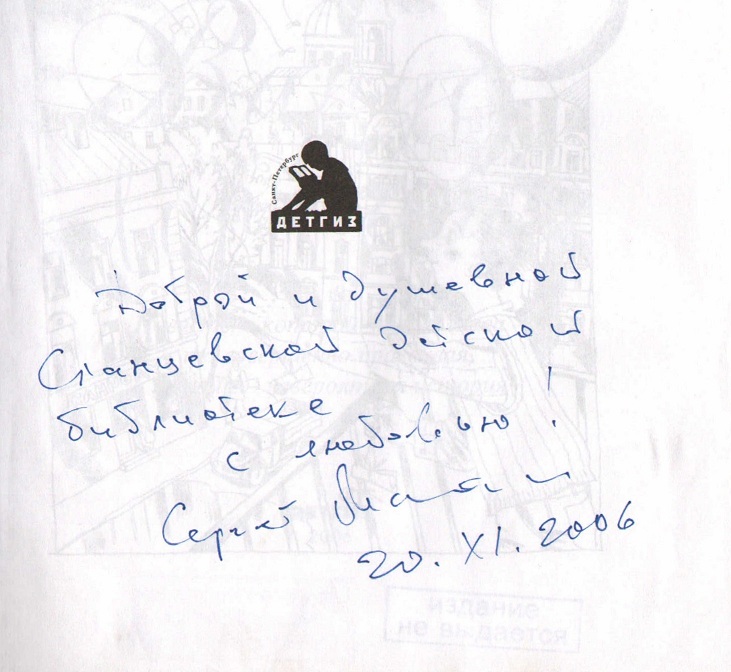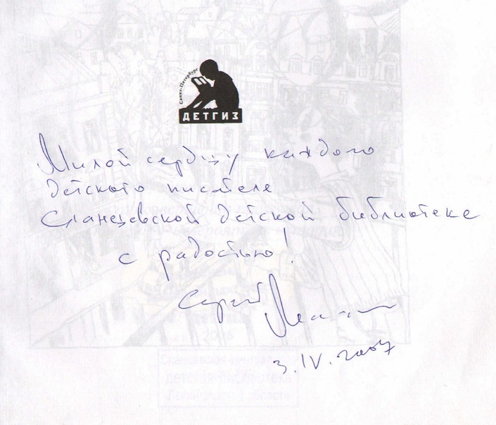 «Милой сердцу каждого детского писателя Сланцевской детской библиотеке с радостью!», Сергей Махотин, 3 апреля 2007 года.
