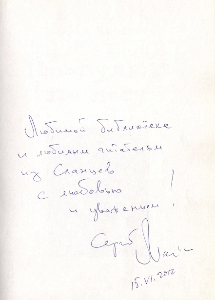 «Любимой библиотеке и любимым читателям из Сланцев, с любовью и уважением», Сергей Махотин, 15 июня 2012 года.