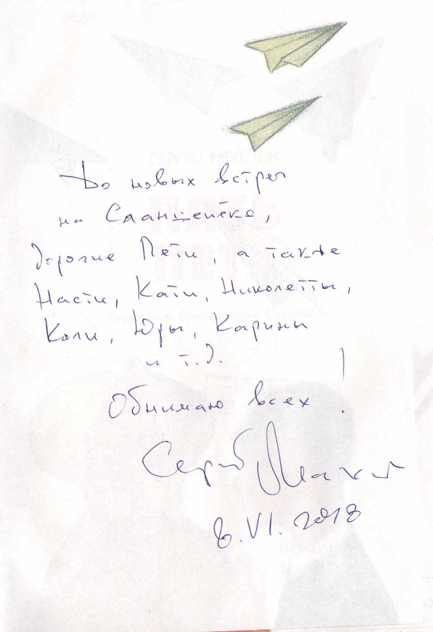 «До новых встреч на Сланцепёке! Дорогие Пети, а также Насти, Кати, Николетты, Коли, Юры, Карины и т.д. Обнимаю всех!», Сергей Махотин, 8 июня 2018 года.