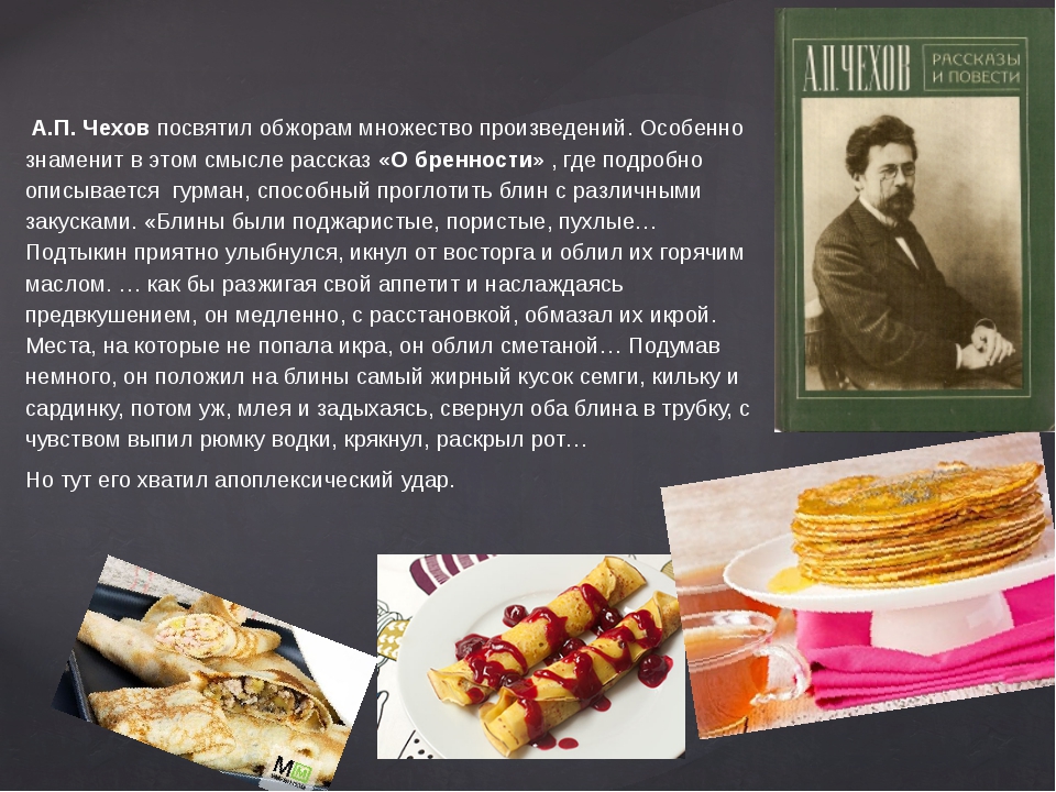 В качестве примера председатель книжного сообщества Наталья Ивановна Карпова выбрала рассказы «Блины», «Глупый француз», «Сирена», «О бренности», «Анна на шее», «Устрицы». В них детально описываются сами блюда, и, самое главное, - чувства, которые испытывают главные герои во время трапезы. «Блины были поджаристые, пористые, пухлые, как плечо купеческой дочки… Подтыкин приятно улыбнулся, икнул от восторга и облил их горячим маслом. Засим, как бы разжигая свой аппетит и наслаждаясь предвкушением, он медленно, с расстановкой обмазал их икрой. Места, на которые не попала икра, он облил сметаной… Оставалось теперь только есть, не правда ли? Но нет! Подтыкин взглянул на дела рук своих и не удовлетворился… Подумав немного, он положил на блины самый жирный кусок семги, кильку и сардинку, потом уж, млея и задыхаясь, свернул оба блина в трубку, с чувством выпил рюмку, крякнул, раскрыл рот…»