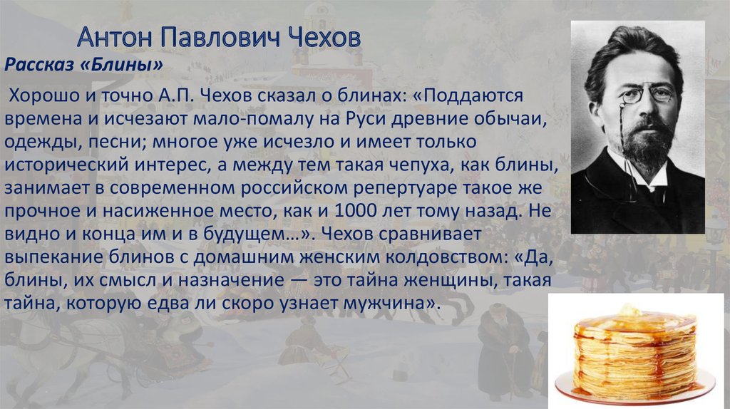 Страстная любовь к рыбалке у Чехова с детства, не случайно караси в сметане – «фирменное» блюдо писателя. Антон Павлович посвятил не один рассказ рыбной ловле: «Налим», «На реке», «Рыбье дело» - остроумный «трактат советов рыболовам», подсоленный тонким чеховским юмором. Ещё писатель обожал блины, любил их «так искренне, так нежно», что, когда писал об этом, становился поэтом. «Как пекут блины?... Это тайна! Что это есть не простое поливание горячих сковород жидким тестом, а священнодействие, целая сложная система, где существуют свои верования, традиции, язык, предрассудки, радости, страдания». А вишневый сад у Антона Павловича - символ жизни, вспомним известную во всем мире одноименную пьесу.